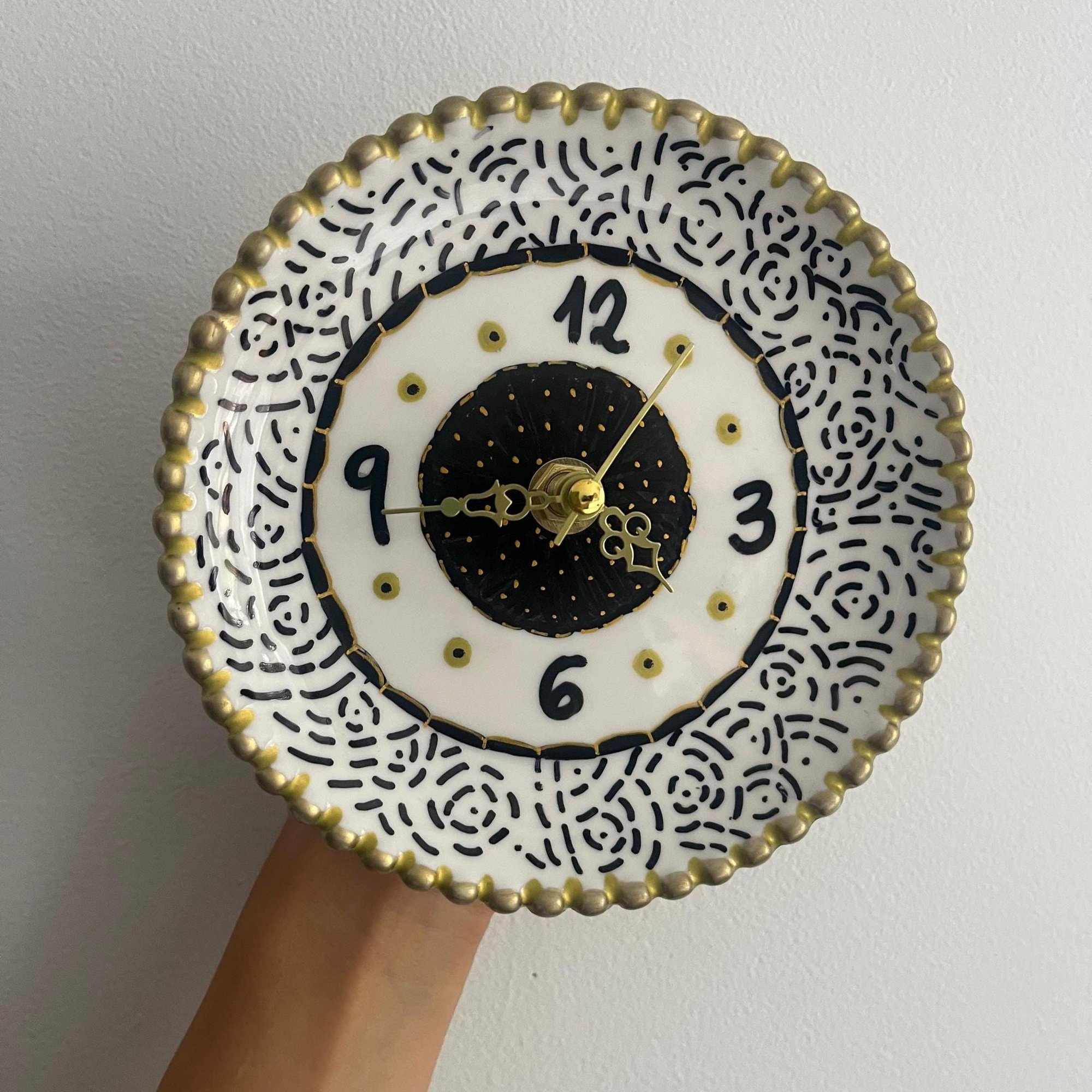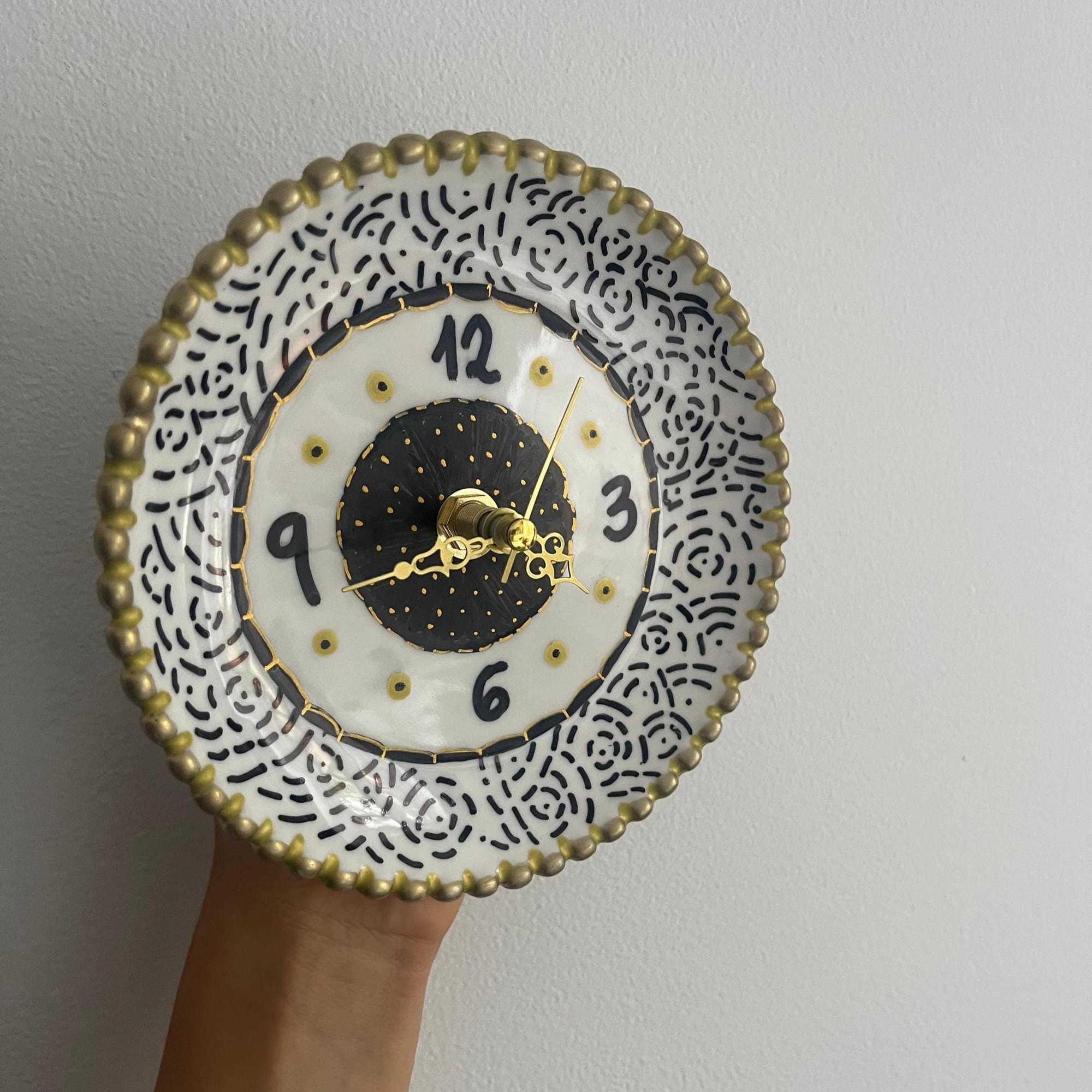 5.5" Black & Gold Ceramic Plate Clock: Handmade Boho Desk or Wall Decor