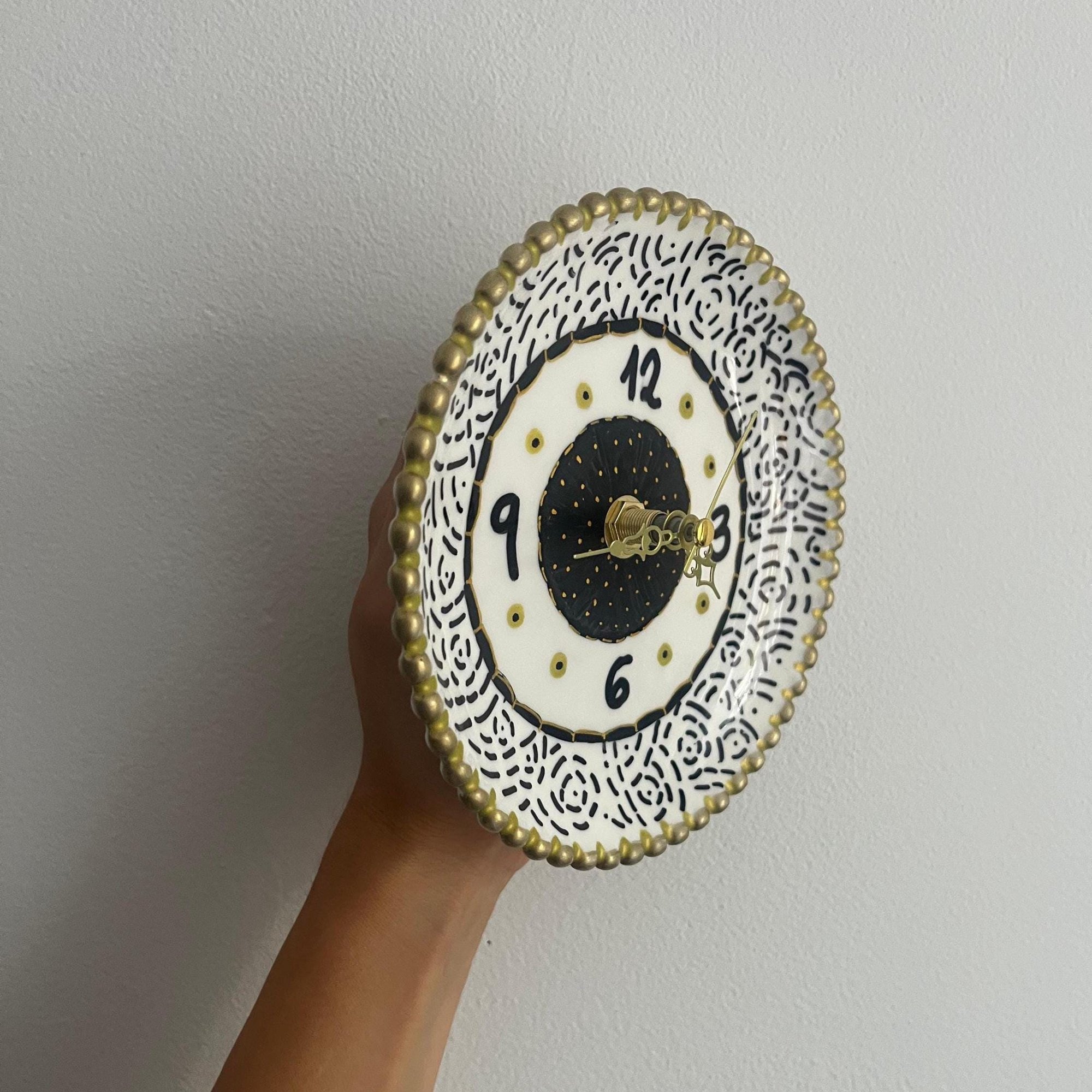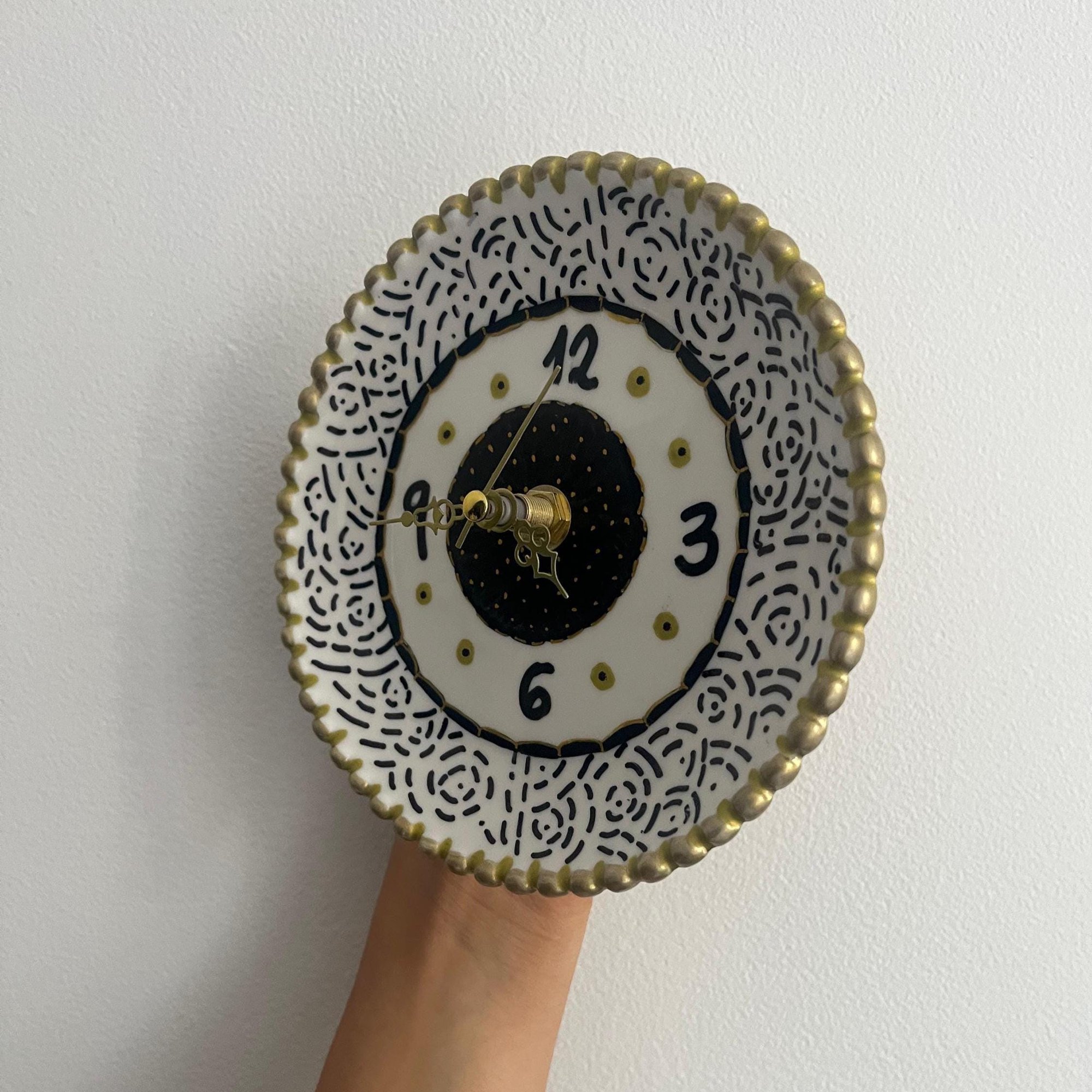 Chic, modern, and timelessāthis handmade ceramic clock features a bold black-and-gold design accented with delicate hand-painted details. Crafted on a petite ceramic plate, it combines sophistication with functionality, making it a striking accent piece for your wall, desk, shelf, or mantle.