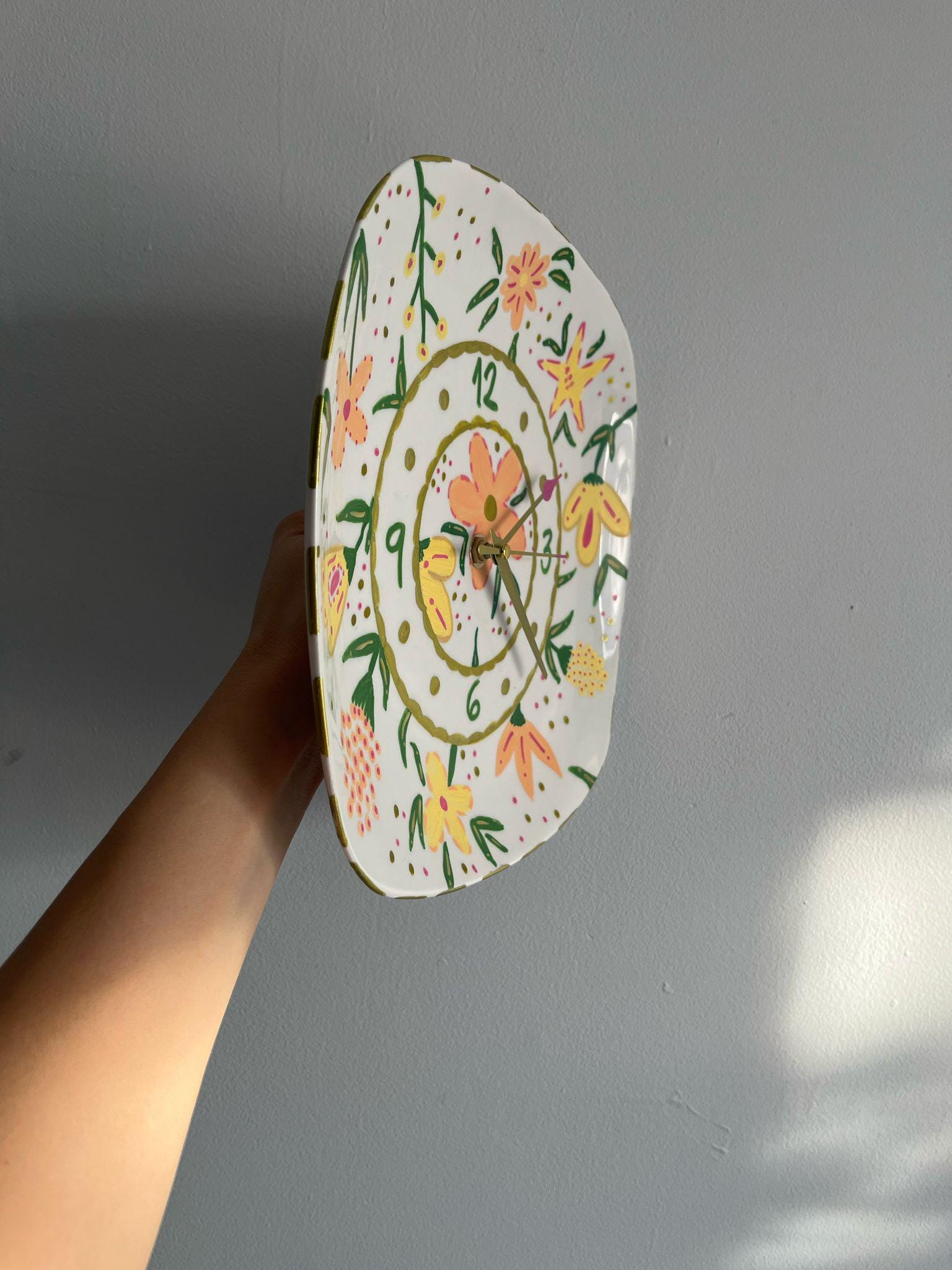 Elevate your home with this stunning 11-inch Floral Ceramic Plate Clock. Crafted from a premium repurposed porcelain plate, this piece features intricate hand-painted blooms in gold, coral, and spring green. It’s more than a clock—it’s a sustainable statement piece.