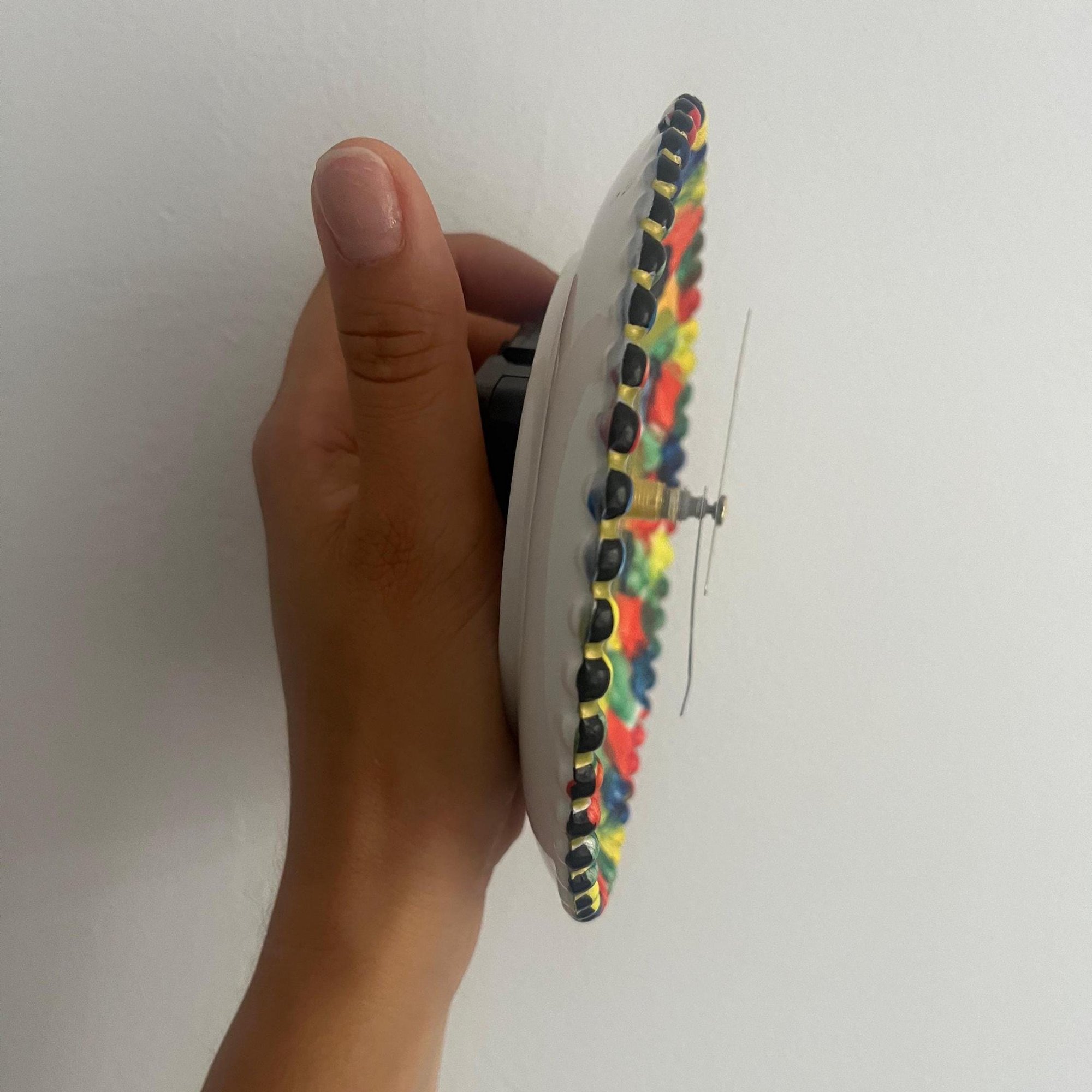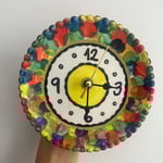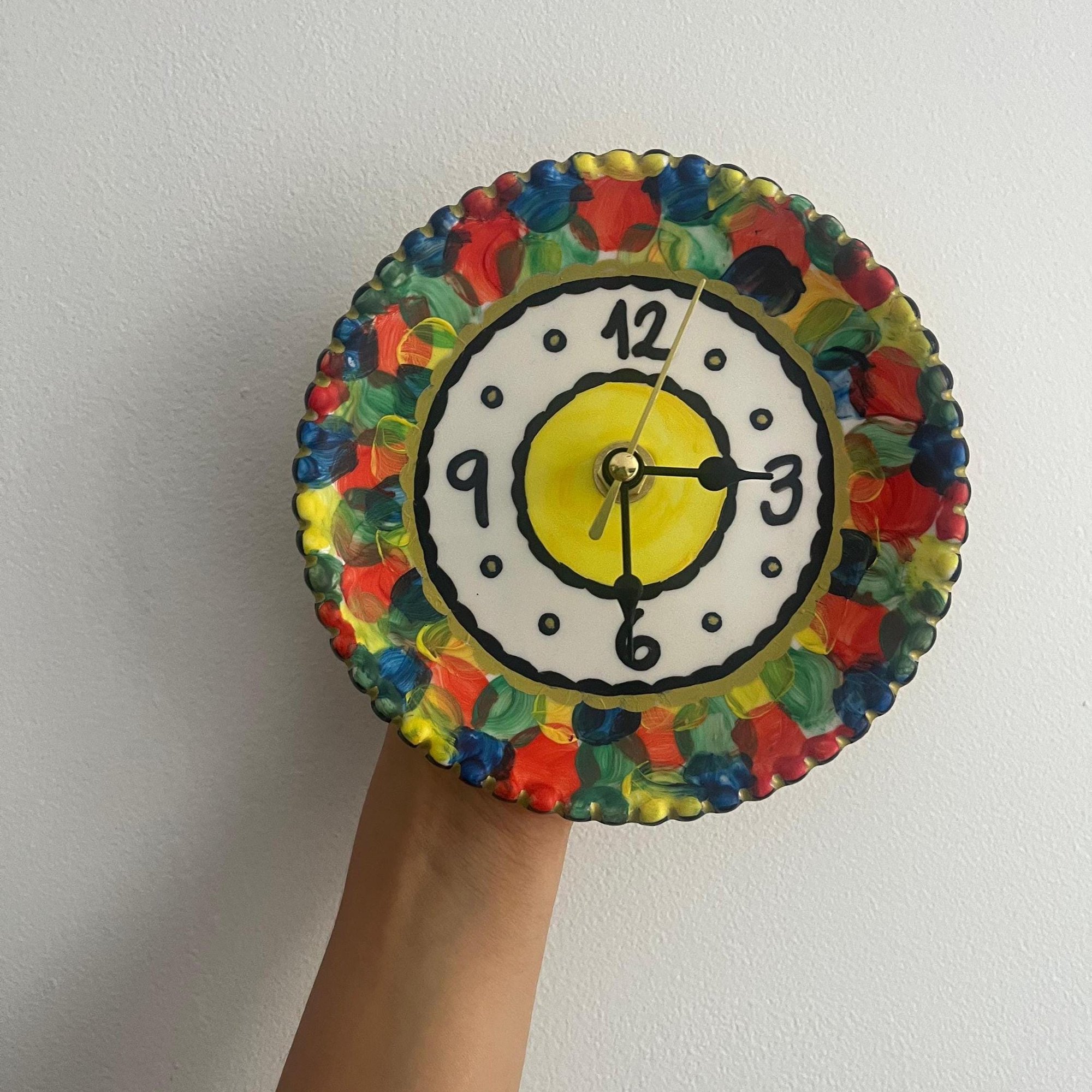 Bright, cheerful, and full of personality—this handmade ceramic clock transforms a small plate into a one-of-a-kind functional artwork. Its vibrant brushstroke border of red, yellow, green, and blue frames a playful center design, making it the perfect accent for any room.