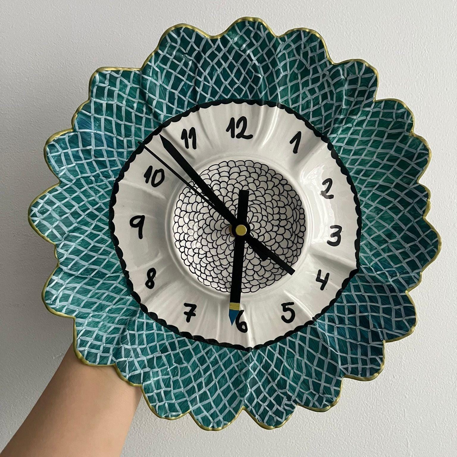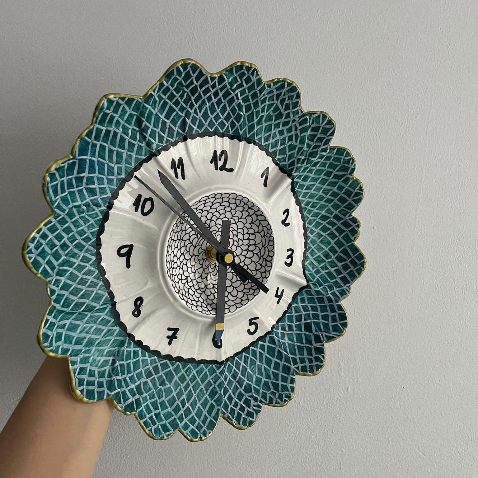 10" Hand-Painted Teal Bloom Pottery Clock,Wall Decor, Unique Housewarming Gift, Silent clock