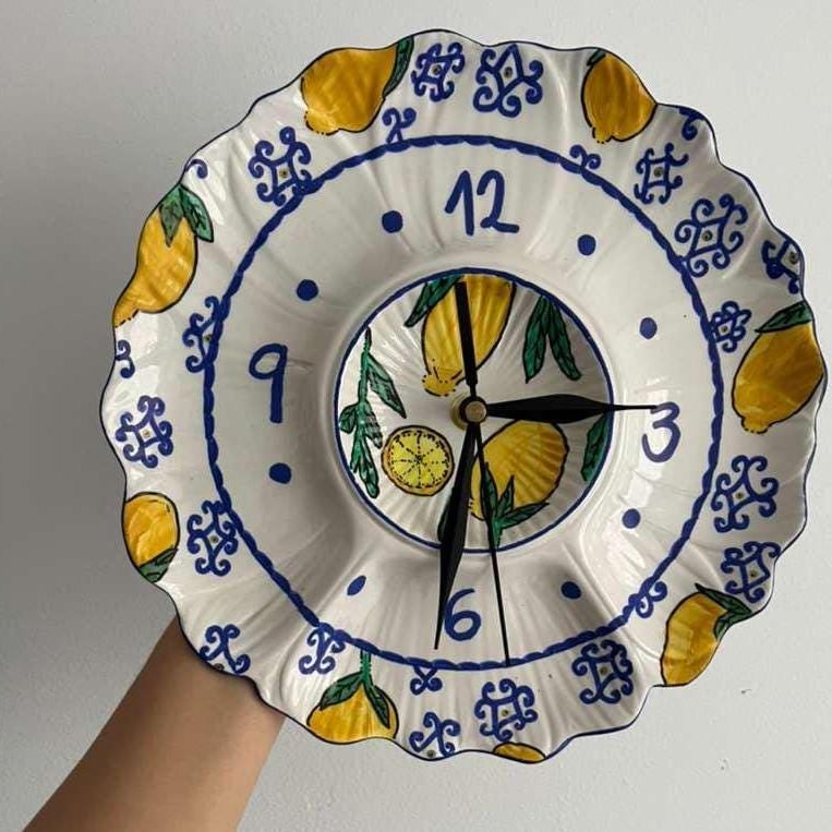 Made by an eco artist committed to sustainability, this wall clock transforms a once-unused plate into a functional piece of art. The design features bright yellow lemons and classic cobalt blue scrollwork, instantly evoking the sun-drenched spirit of the Amalfi Coast. This vibrant piece is perfect for adding coastal charm to your kitchen, dining room, or sunroom.